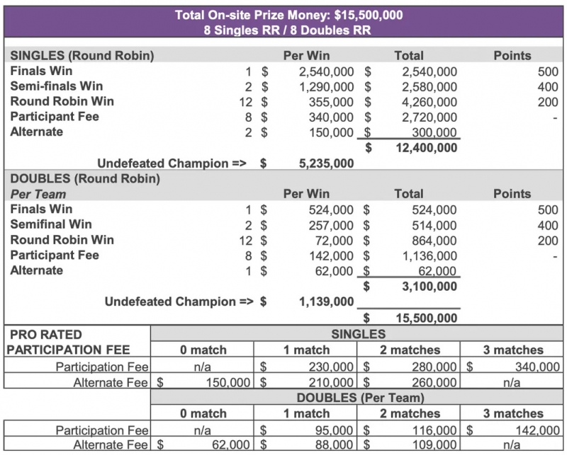 Непобеден шампион поединично ще получи 5,235 милиона долара, а шампион на сингъл с една загуба в груповата фаза ще си тръгне с 4,88 милиона долара. В двойките перфектен резултат 5-0 ще донесе 1,139 милиона долара, а една загуба в груповата фаза – 1,067 милиона долара.